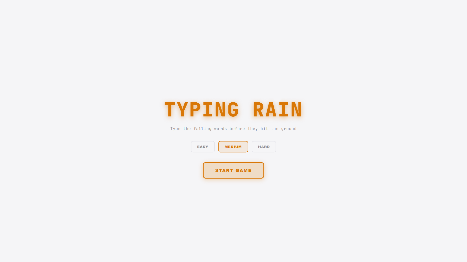 Words fall from above — type them before they hit the bottom. You have 3 lives. Great for speed and reflex practice.